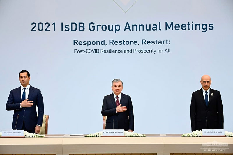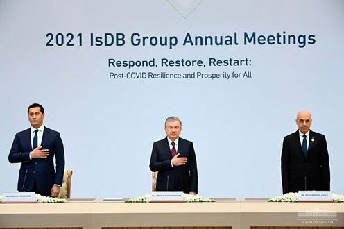 Чапдан ўнгга: Бош вазир ўринбосари, Инвестициялар ва ташқи савдо вазири Сардор Умурзоқов, Ўзбекистон президенти Шавкат Мирзиёев, ИТБ президенти Муҳаммад Ал-Жассир . Ўзбекистон президенти матбуот хизмати фотосурати