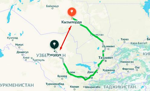 Ҳозирда Қизилўрдадан Учқудуққа Ўзбекистоннинг қатор вилоятлари орқали етиб бориш мумкин. Карта скриншоти