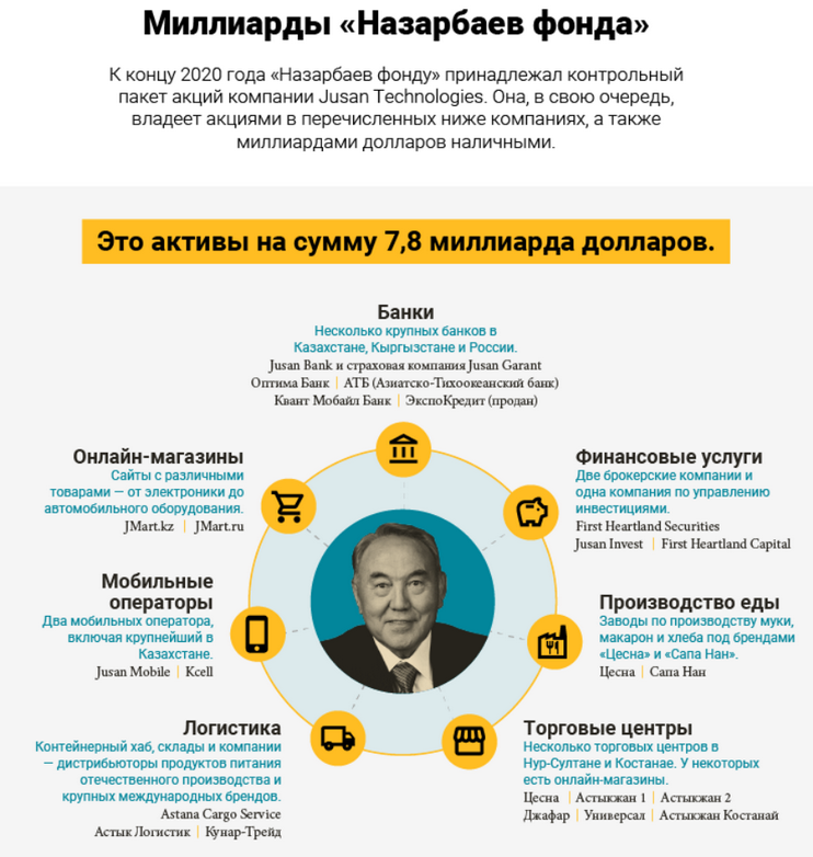 «Қозоғистон оммавий ахборот воситалари Назарбоевга қарашли хайрия жамғармаларининг кўплаб хайрли ишларини баландпарвоз сўзлар билан ёритиб келади. Бироқ, фондлар бошқа функцияни ҳам бажаради: улар миллиардлаб долларлик активларни бошқаради. Булар- умумий қиймати камида 8 миллиард доллар бўлган ҳашаматли меҳмонхоналар, банклар, заводлар, омборхоналар ва бошқа активлардир. Расмий жиҳатдан Назарбоев бу бойликларга эгалик қилмайди, лекин у фондлар асосчиси бўлгани учун уларни назорат қилади», — дейилади нашр хабарида.