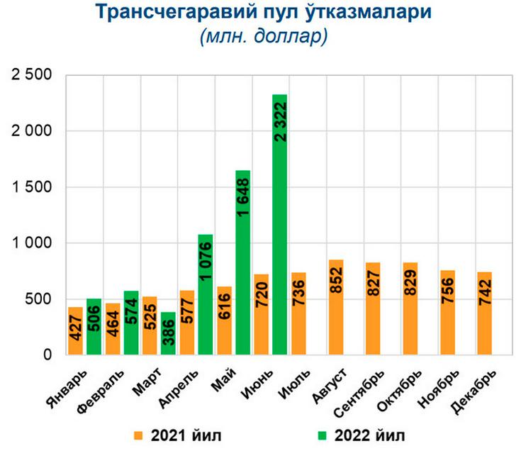 Апрель ойида Ўзбекистонга хориждан 1,07 миллиард доллар келиб тушди, бу ўтган йилнинг шу даврига нисбатан деярли икки баравар кўп. Май ойида 1,65 млрд доллар (ўсиш 2,7 марта), июнь ойида 2,32 млрд доллар (ўсиш 3,25 марта) ўтказилган.